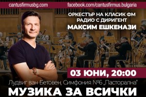 През месец юни продължават online срещите с музикалното изкуство във Facebook страницата на “Кантус Фирмус“. По повод годината на Бетовен на 3 юни, сряда, от 20:00 ч. ще излъчим запис на Симфония № 6 „Пасторална“ – една от най-хубавите оркестрови творби на композитора, в която той отразява преклонението си пред красотата и силата на природата. Изпълнението е на Оркестъра на Класик ФМ радио и чаровния маестро Максим Ешкенази.