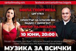 На 10 юни, сряда, от 20:00 ч. на Facebook страницата на „Кантус Фирмус“ ще бъдат излъчени записи на талантливата цигуларка Мила Георгиева и Оркестъра на Класик ФМ радио с диригент Григор Паликаров. Програмата ще започне с увертюра към операта „Дон Жуан“ от Волфганг Амадеус Моцарт, след което ще звучи един от най-обичаните цигулкови концерти – този на Пьотр Илич Чайковски. Следват Унгарски танц №5 от Йоханес Брамс и виртуозната миниатюра „Малка токата“ от Петър Христосков.