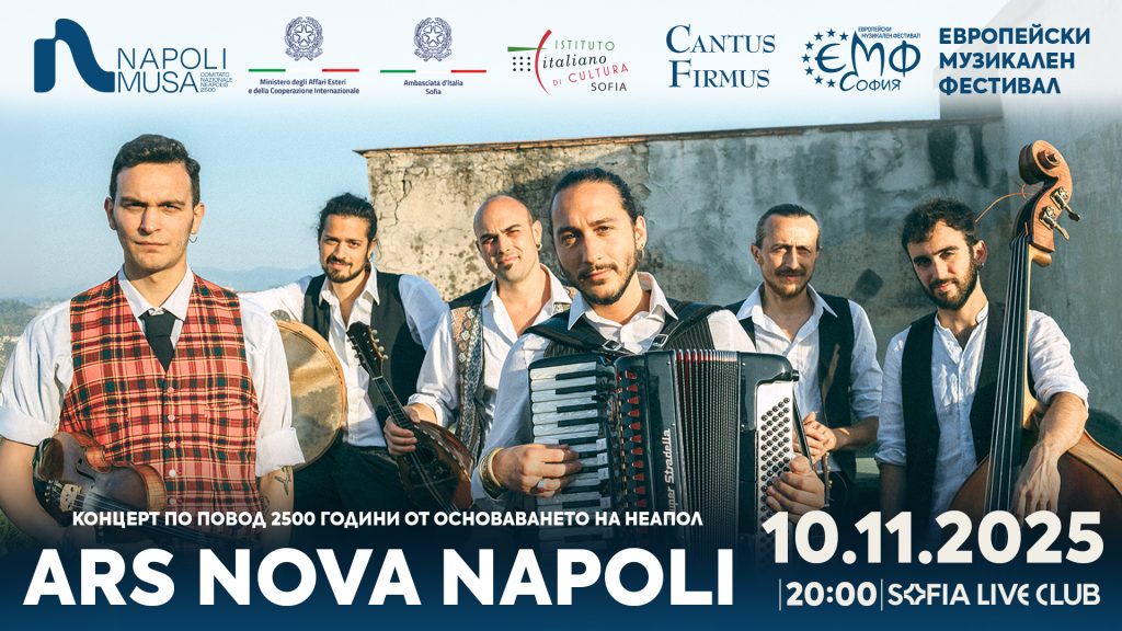 2500 години от основаването на красивия и колоритен италиански град Неапол ще бъдат отбелязани със специално събитие в София, което е част от програмата на 25-ия Европейски музикален фестивал. У нас ще пристигне една от най-известните и ценени музикални групи от сцената на новия неаполитански фолк – формацията ARS NOVA NAPOLI. В нея участват шестима виртуозни музиканти: Марчело Скуиланте (вокал, акордеон), Микеланджело Нуско (цигулка, тромпет, мандолина), Винченцо Рачопи (мандолина), Джанлука Фуско (вокал, китара, акордеон, гайда), Антонино Анастасия (перкусии) и Бруно Беларди (контрабас), които ще отведат публиката в сърцето на Южна Италия с нови интерпретации на фолклорни песни и оригинални композиции, вдъхновени от Средиземноморската култура. Програмата е изпълнена с енергия, ритъм и страст и преоткрива богатата музикална традиция на Италия, поддържайки живата връзка между минало и съвременност.