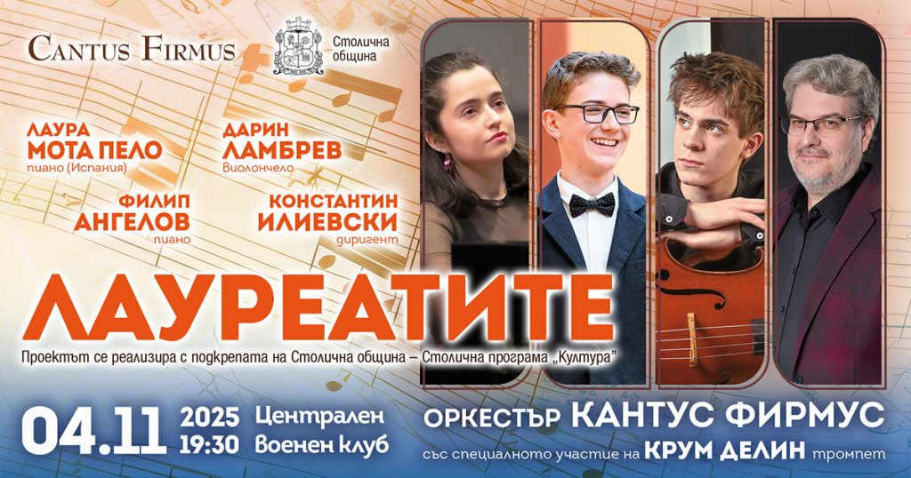 Днес (4 ноември 2025 г.) трима изключителни млади музиканти ще дебютират в рамките на проекта „Лауреатите“, организиран от агенция „Кантус Фирмус“ с финансовата подкрепа на Програма „Култура“ на Столичната община. На сцената ще излязат Дарин Ламбрев (виолончело, 15 г.) и Филип Ангелов (пиано, 13 г.) – носители на Голямата награда от Четвъртия национален конкурс „Кантус Фирмус“, както и специалният гост от Испания – Лаура Мота Пело (пиано, 22 г.), носителка на две отличия от конкурса „Геза Анда“ (2024).
