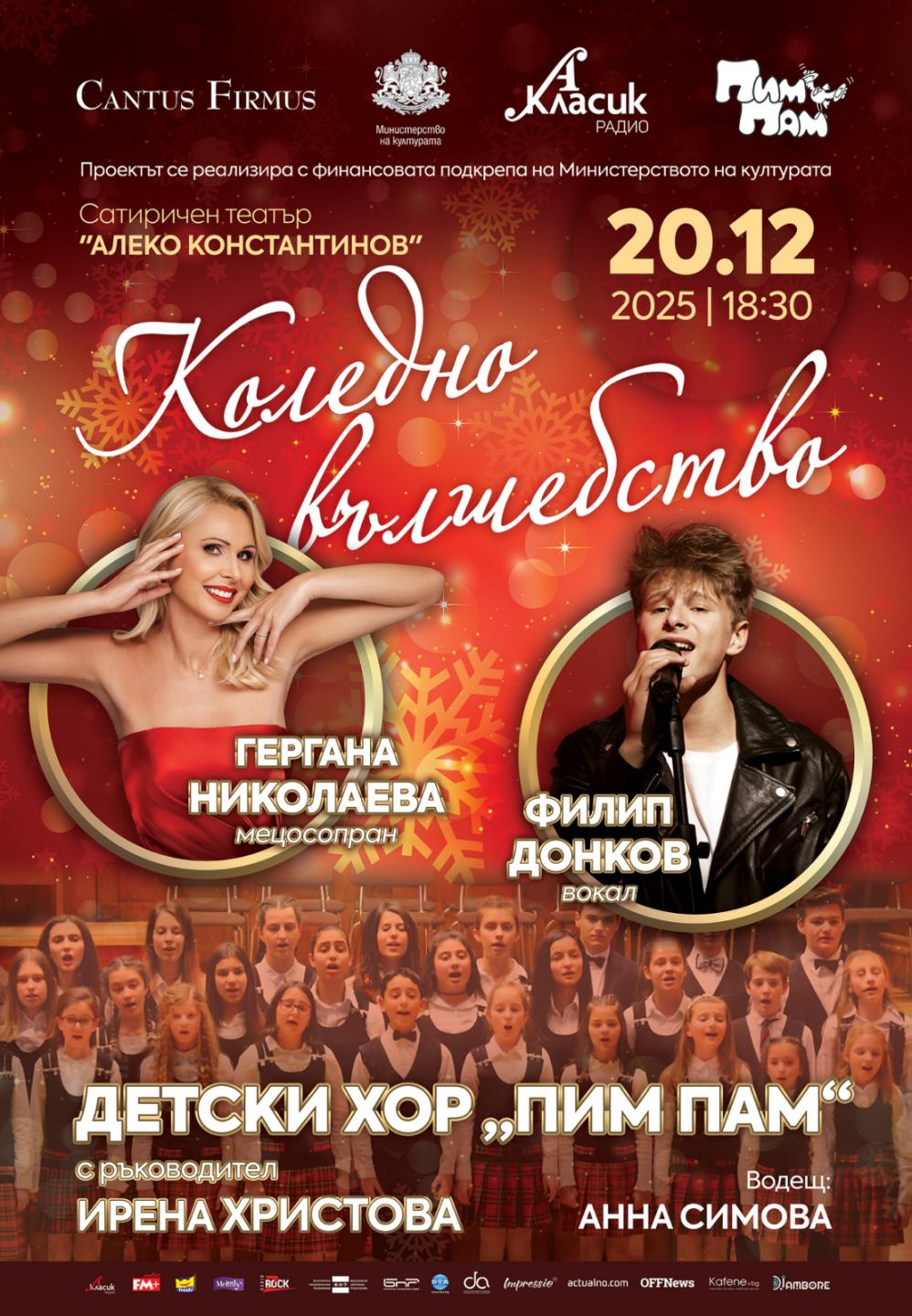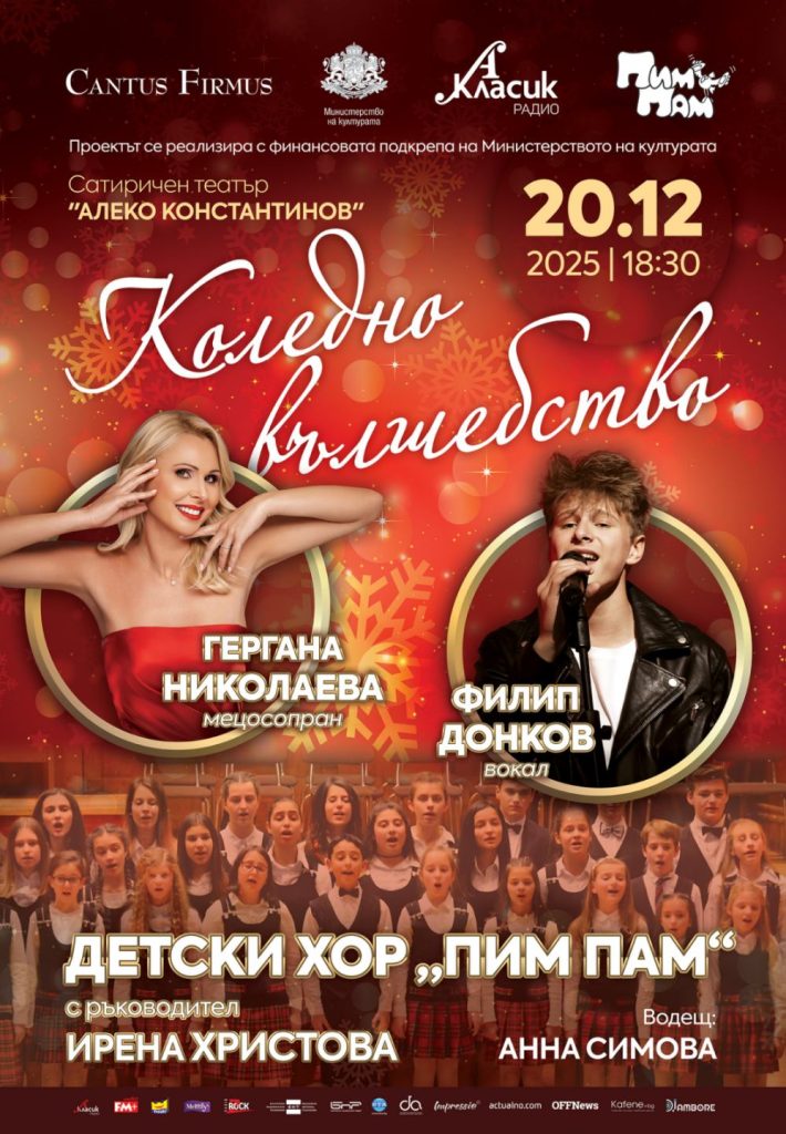 Концертът „Коледно вълшебство“ кани столичани и гостите на града да преживеят магията на Рождество чрез силата на изкуството. Празничното музикално преживяване ни помага да си припомним духовното значение на Коледа като време на любов, мир, семейна близост и споделени емоции. Концертът се организира от „Кантус Фирмус“ с финансовата подкрепа на Министерството на културата на Р. България. Водещ на събитието ще бъде актрисата Анна Симова, която също е започнала своя път в изкуството като част от „Пим-Пам“.