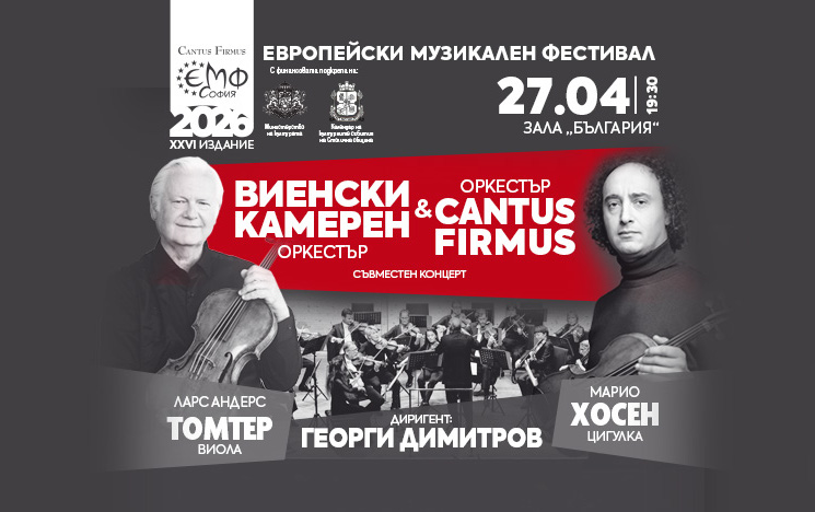 Точно след месец, на 27 април, „Европейски музикален фестивал“ кани столичани на една необикновена музикална вечер, в която сцената ще бъде споделена от два елитни ансамбъла – един от Виена и един от София. Прочутият Виенски камерен оркестър (Wiener KammerOrchester), състав с 80-годишна славна история и впечатляваща концертна дейност, и Оркестър Cantus Firmus, един от най-реномираните български фестивални ансамбли, ще свирят рамо до рамо, обединявайки своите традиции, звук и енергия в уникално музикално сътрудничество.