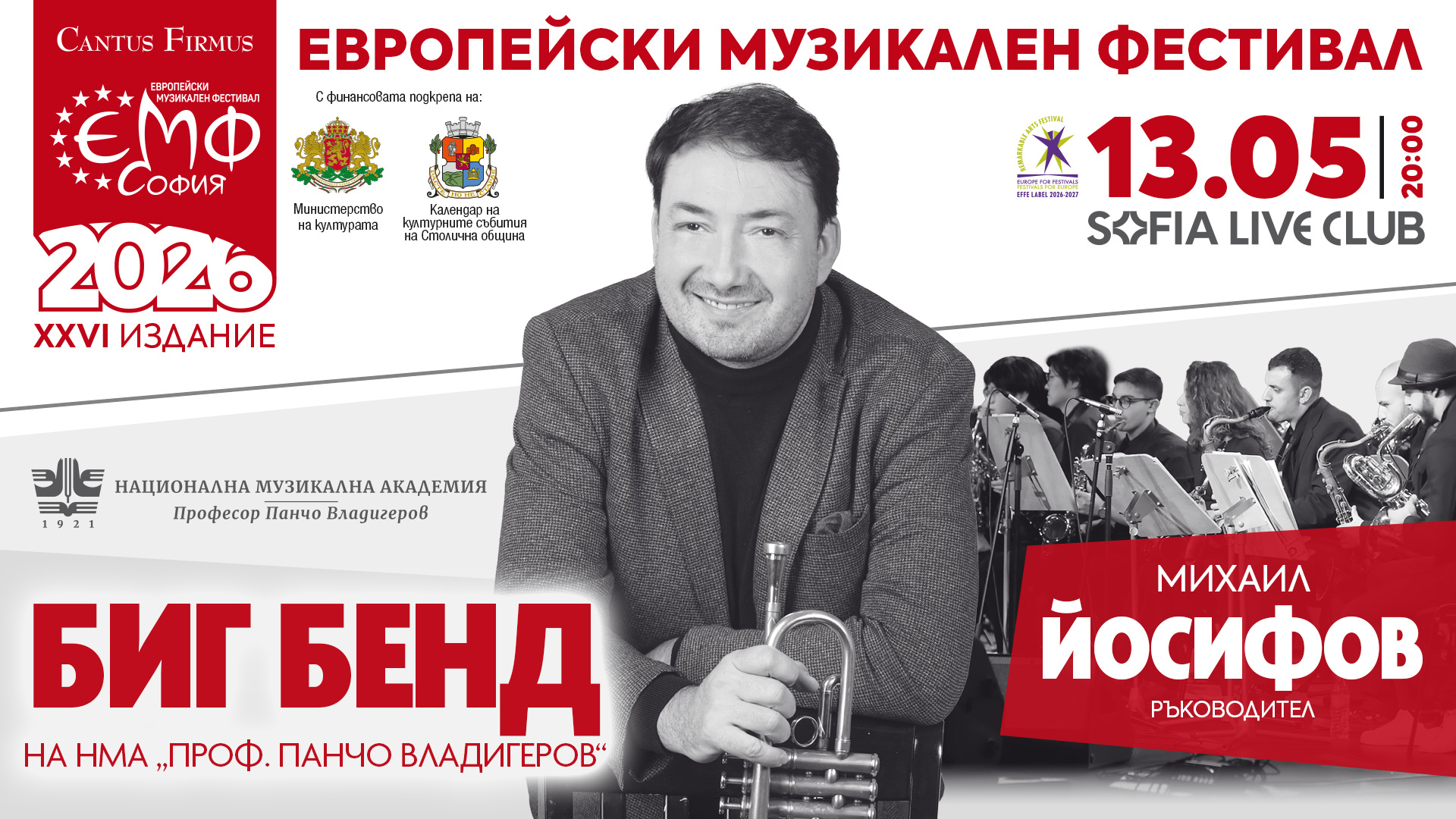 С амбиция, енергия и ярко артистично присъствие младите музиканти от Биг бенда на Националната музикална академия „Проф. Панчо Владигеров“ ще завладеят сцената на Европейския музикален фестивал на 13 май от 20:00 ч. в Sofia Live Club. Заедно със своя бенд лидер Михаил Йосифов, тромпетист, композитор и педагог, утвърдил се като един от най-ярките представители на съвременния български джаз, студентският оркестър вече има своето заслужено място на професионалния подиум. Концертът ще предложи нови, вдъхновяващи аранжименти на песни от класиците на българската естрада. Като солисти ще участват и млади вокалисти, обучаващи се в катедра „Поп и джаз изкуство“ на академията. Събитието се реализира в партньорство с Националната музикална академия „Проф. Панчо Владигеров“ и с финансовата подкрепа на Министерството на културата и Столичната община – Календар на културните събития за 2026 година. БИЛЕТИ ЗА СЪБИТИЕТО