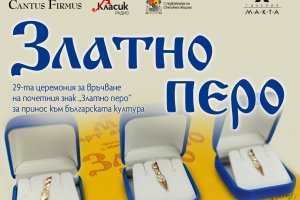 В навечерието на 24-ти май, Деня на българската азбука, просвета и култура, за 29-ти път тази година ще се състои тържествената церемония за връчване на отличията „Златно перо“. 24-ма изтъкнати представители на българската литература, театър, музика, изобразително изкуство, кино и журналистика ще получат изящна златна брошка във формата на писец, изработена от 24-каратово злато. Всеки един от тях има безспорни постижения в съответната област и неговото присъствие сред носителите на приза е заслужено признание и чест. Вече са ясни имената на 23-ма лауреати на почетния знак, които тази година ще се окичат със „Златно перо“. Сред тях са видните творци акад. Пламен Карталов, забележителен оперен режисьор и педагог, проф. Аксиния Джурова, културолог и изследовател в областта на историята на изкуството, художничката Надежда Кутева, композиторът Стефан Диомов, актьорът и фотограф Владимир Карамазов, журналистът Светослав Иванов, диригентът и композитор Константин Илиевски и др. Вижте повече за събитието и пълния списък на номинираните ТУК.